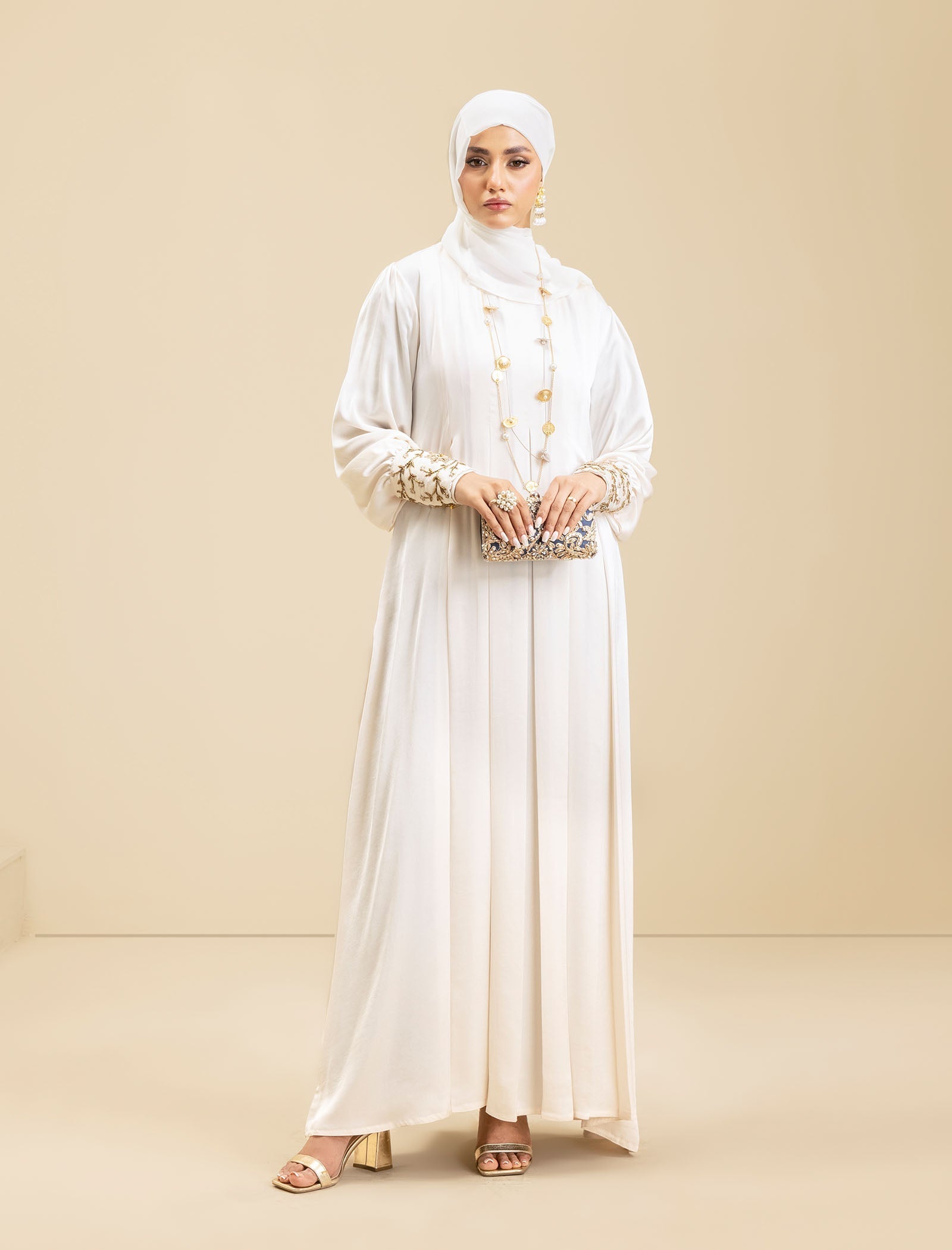 The Pure Pearl abaya is crafted from luxury silk, offering a smooth, sophisticated finish. The cream-colored fabric exudes elegance, while the exclusive handwork on the cuffs adds a refined touch, making this abaya a true style statement.